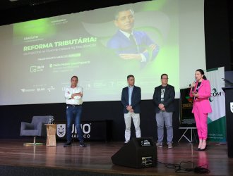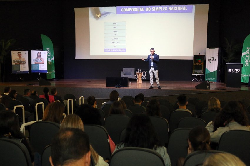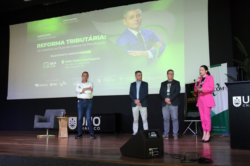 Uma noite de esclarecimentos, alertas e preparação para um novo cenário tributário. Assim foi a palestra “Reforma tributária: os impactos no fluxo de caixa e na precificação”, realizada ontem (25), à noite, no Salão Nobre da Unochapecó. O evento foi promovido pelo Sindicato dos Contabilistas de Chapecó (Sindicont), pelo Sindicato do Comércio da Região de Chapecó (Sicom) e pela Unochapecó, com apoio da CBA Soluções em TI, e reuniu empresários, gestores, contadores e estudantes.